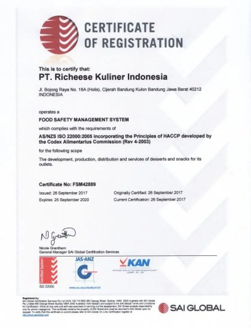 Richeese Kuliner Indonesia berinovasi untuk menghasilkan makanan dan minuman yang aman, bergizi, berkualitas dan halal sesuai dengan regulasi pemerintah dan kepuasan konsumen dengan penerapan sistem pengelolaan keamanan pangan dan perbaikan berkesinambungan.